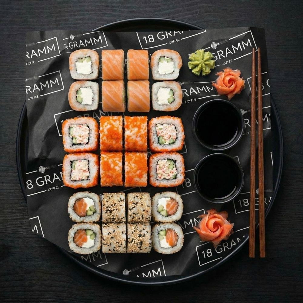 Ролл «Калифорния», ролл «Филадельфия», ролл «Лосось маки», соевый соус 2шт, имбирь 2шт, васаби 2шт