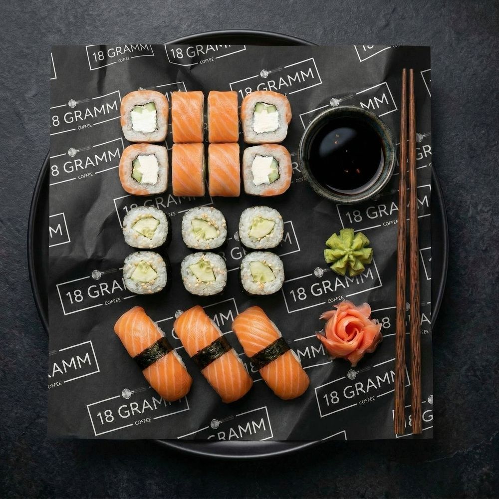 Ролл «Филадельфия», ролл «Капа маки», суши «Лосось», соевый соус, имбирь, васаби