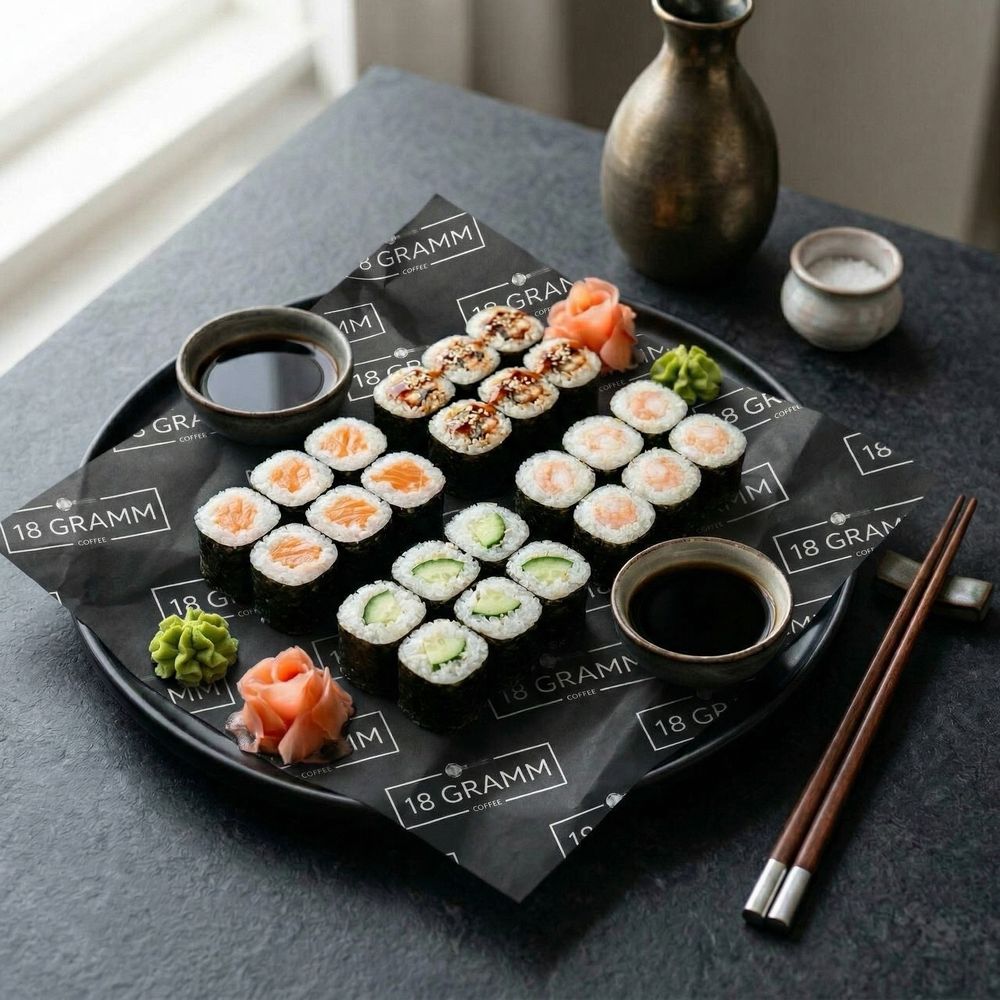 Ролл «Унаги маки», ролл «Капа маки», ролл «Сяке маки», соевый соус 2шт, имбирь 2шт, васаби 2шт