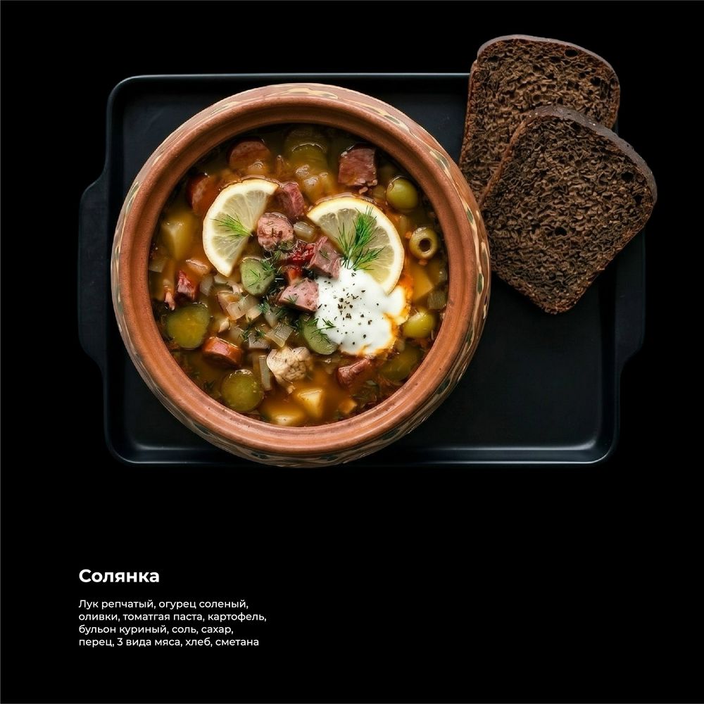 Лук репчатый, огурец соленый, оливки, томатная паста, картофель, бульон куриный, соль, сахар, 3 вида мяса