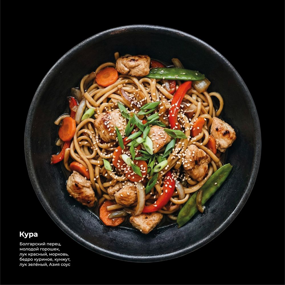 Болгарский перец, молодой горошек, лук красный, морковь, бедро куриное, кунжут, лук зеленый, Азия соус