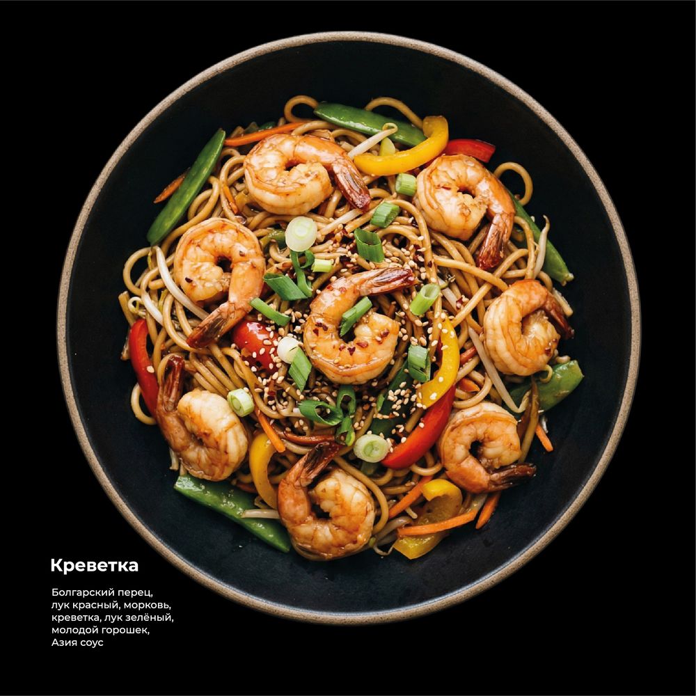 Болгарский перец, лук красный, морковь, креветка, лук зеленый, молодой горошек, Азия соус