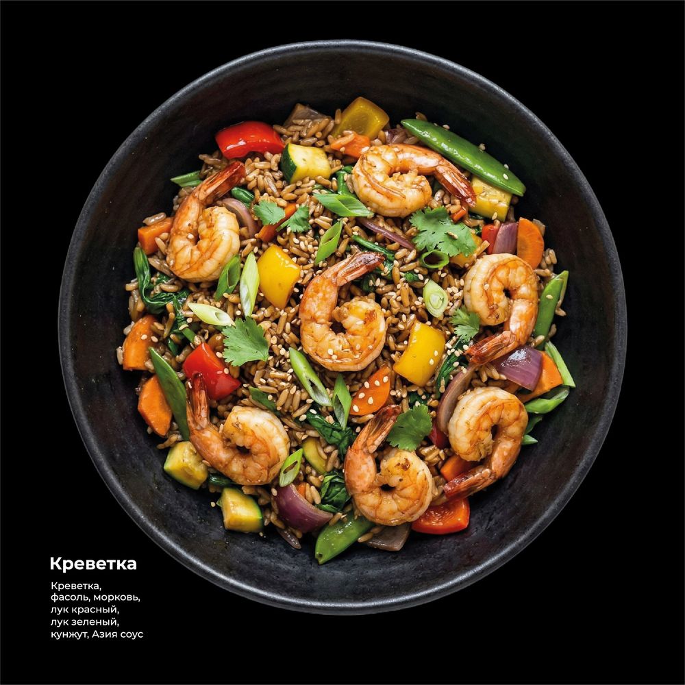 Креветка, фасоль, морковь, лук красный, лук зеленый, кунжут, Азия соус