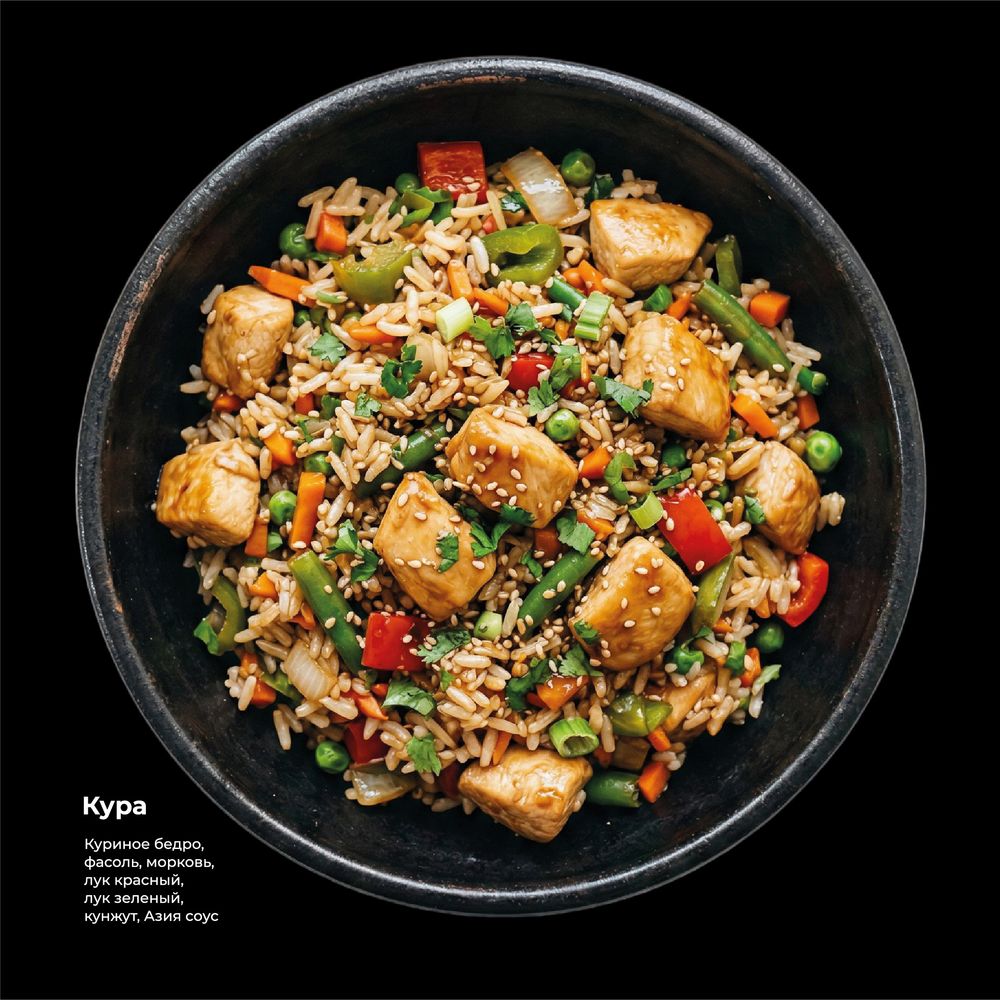 Куриное бедро, фасоль, морковь, лук красный, лук зеленый, кунжут, Азия соус