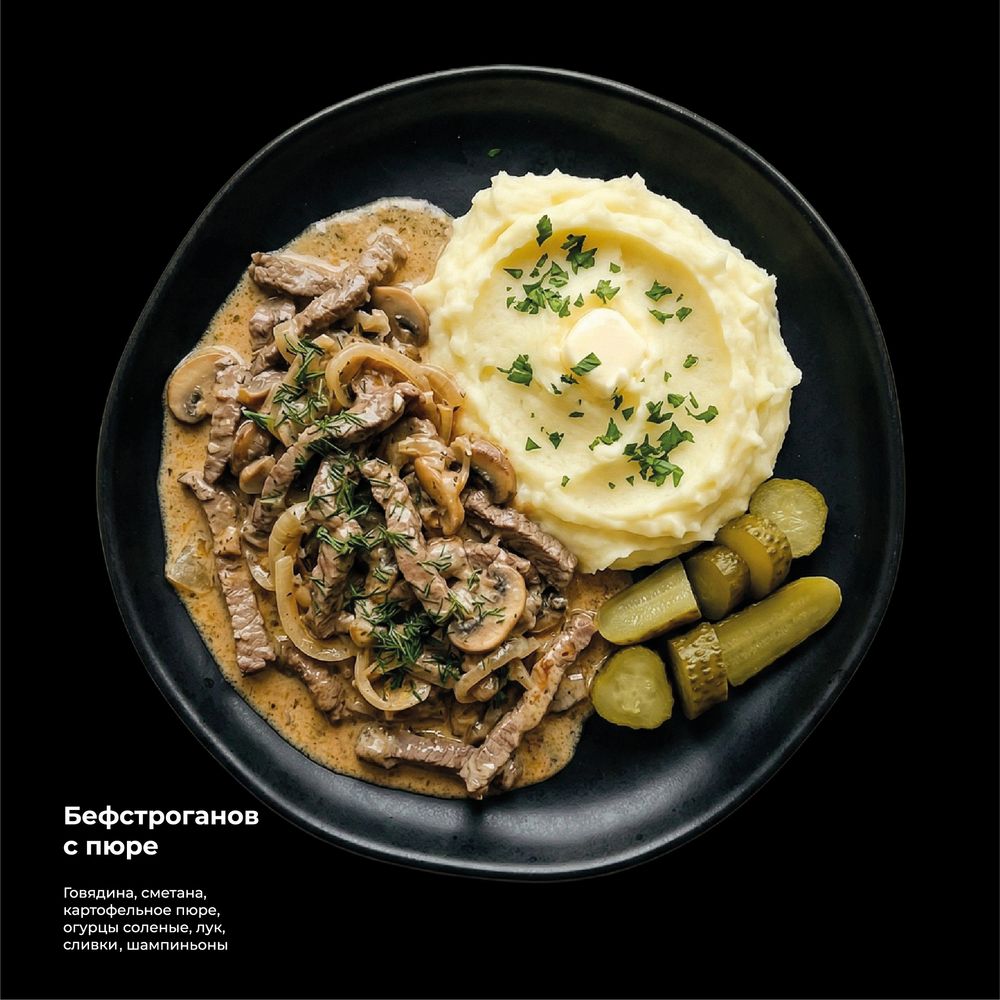 Говядина, сметана, картофельное пюре, огурцы соленый, лук, сливки, шампиньоны