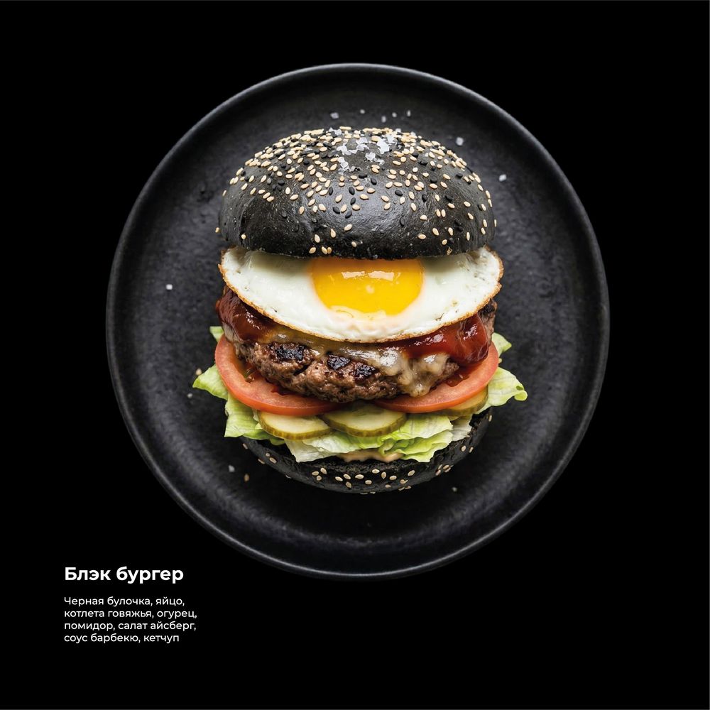 Черная булочка, яйцо, котлета говяжья, огурец, помидор, салат айсберг, соус барбекю, кетчуп
