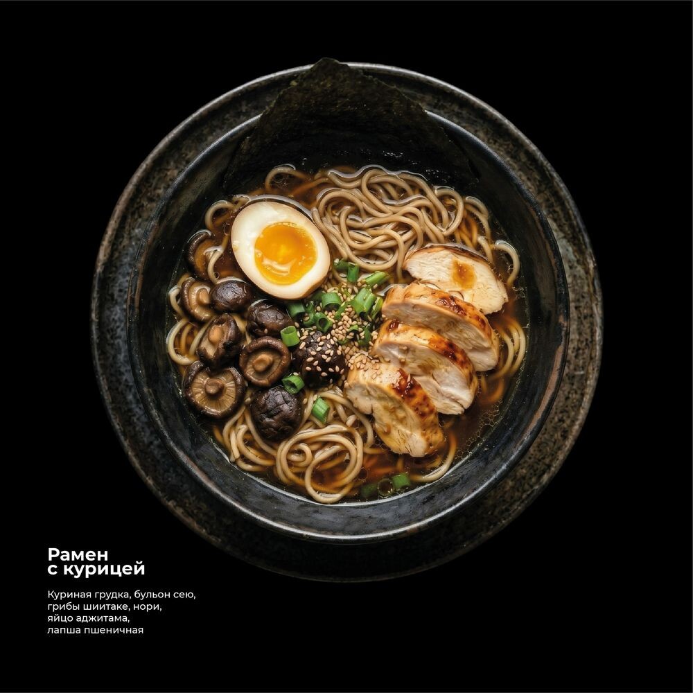 Куриная грудка, бульон сею, грибы шампиньоны, нори, яйцо аджитама, лапша пшеничная